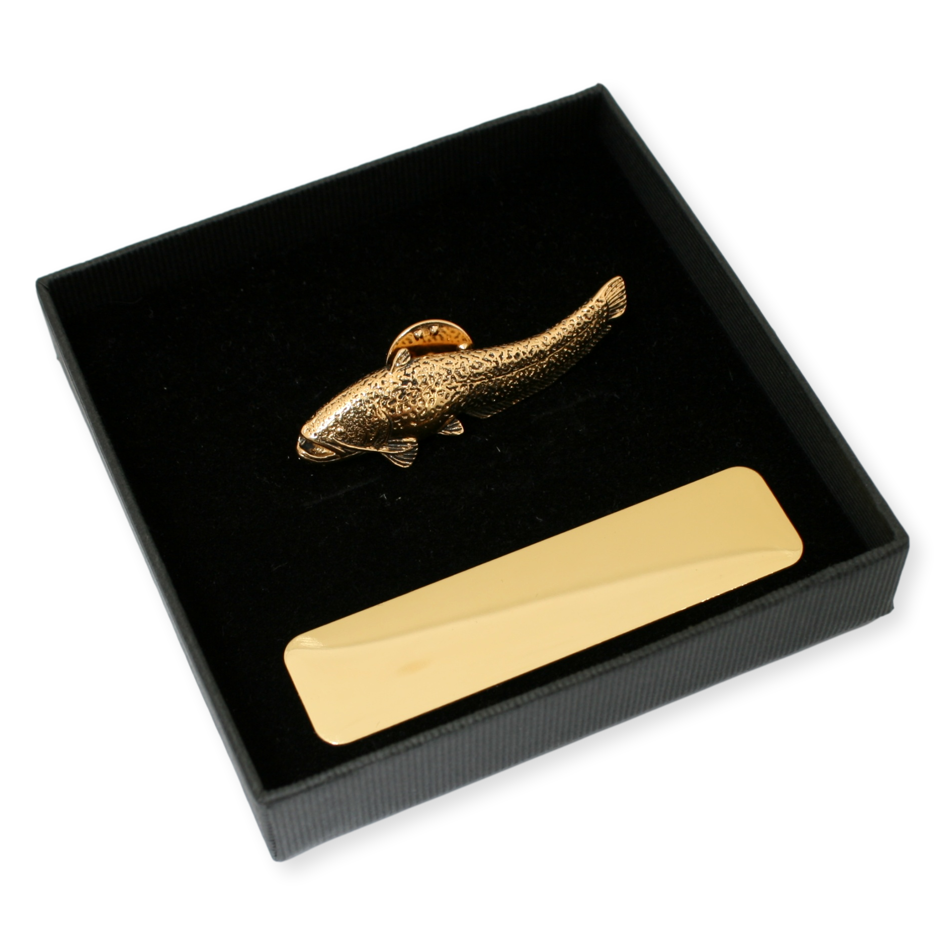 Enhance your collection with our stunning gold catfish Pin Badge, meticulously crafted with 22ct gold plating for a touch of elegance. This sophisticated badge can be customised with optional engraving on the gold plaque.
